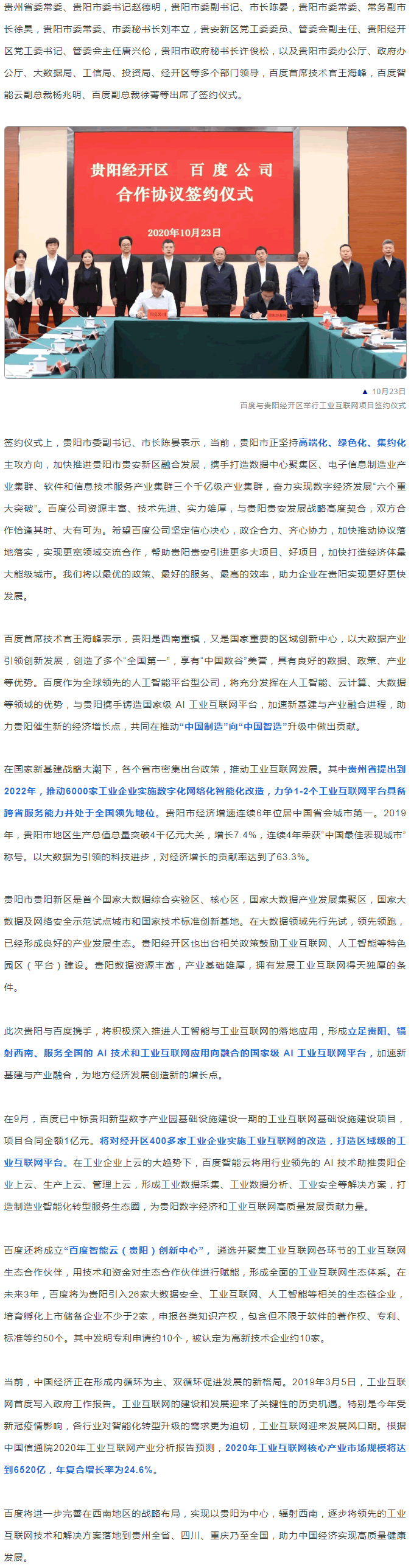 10月23日,百度與貴州省貴陽(yáng)市政府正式簽署戰(zhàn)略合作協(xié)議,與貴陽(yáng)經(jīng)開區(qū)舉行工業(yè)互聯(lián)網(wǎng)項(xiàng)目簽約儀式。百度將承接貴陽(yáng)經(jīng)開區(qū)工業(yè)互聯(lián)網(wǎng)項(xiàng)目建設(shè),打造 AI 技術(shù)和工業(yè)互聯(lián)網(wǎng)應(yīng)用相融合的 AI 工業(yè)互聯(lián)網(wǎng)平臺(tái),形成多面的工業(yè)互聯(lián)網(wǎng)生態(tài)體系,助力貴陽(yáng)打造3個(gè)千億級(jí)產(chǎn)業(yè)集群,形成新的經(jīng)濟(jì)增長(zhǎng)點(diǎn)。