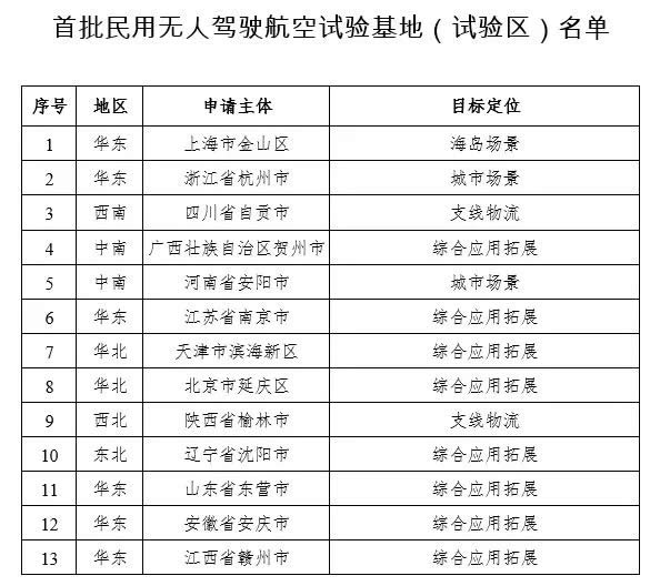 民航局關(guān)于公布首批民用無(wú)人駕駛航空試驗(yàn)基地( 試驗(yàn)區(qū)) 的通知民航各地區(qū)管理局,各運(yùn)輸(通用)航空公司,各機(jī)場(chǎng)公司,空管局、運(yùn)行監(jiān)控中心、民航大學(xué)、飛行學(xué)院、管干院、航科院、民航二所、校驗(yàn)中心、信息中心,各協(xié)會(huì):