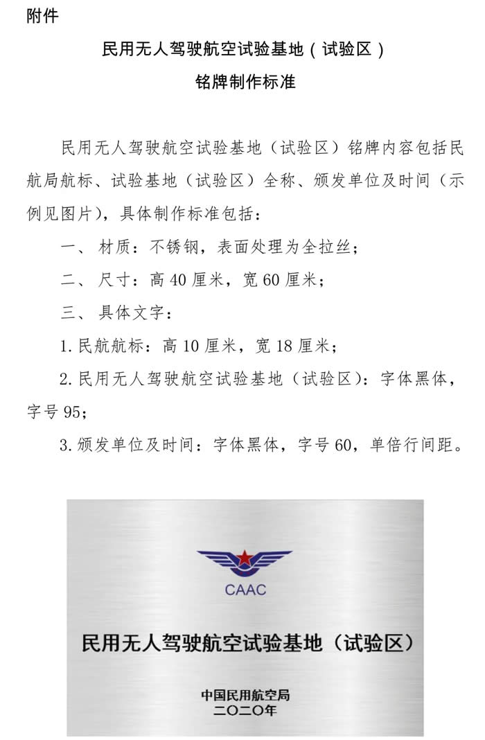 請(qǐng)首批民用無(wú)人駕駛航空試驗(yàn)基地(試驗(yàn)區(qū))所屬地方政府結(jié)合本地實(shí)際,按照各自目標(biāo)定位,進(jìn)一步加強(qiáng)工作推進(jìn),完善運(yùn)行管理機(jī)制,落實(shí)重點(diǎn)任務(wù),做好試驗(yàn)基地(試驗(yàn)區(qū))建設(shè)和運(yùn)行相關(guān)工作,試出成效、確保安全;并按照統(tǒng)一標(biāo)準(zhǔn)自行制作試驗(yàn)基地(試驗(yàn)區(qū))銘牌(標(biāo)準(zhǔn)見附件2) 。