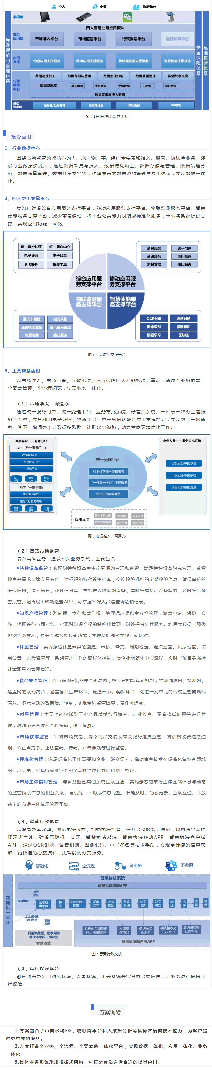 系統以市場準入一網通辦,加強市場監管智慧水平,提升行政執法效能為核心訴求,充分利用5G、物聯網、移動互聯網、大數據等技術手段,打造智慧監管一體化平臺,助力市場準入、監管、執法業務改革與發展。