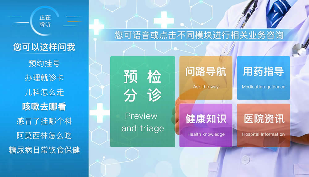 | 智能導(dǎo)診機(jī)器人開(kāi)發(fā)初衷是解決門(mén)診導(dǎo) 醫(yī)人數(shù)較少、重復(fù)問(wèn)答較多的現(xiàn)實(shí)情況。在醫(yī) 院業(yè)務(wù)G峰期人滿為患的情況下,智能醫(yī)療 服務(wù)機(jī)器人可以及時(shí)響應(yīng),可以指導(dǎo)患者就 醫(yī)、引導(dǎo)分診,同時(shí)向患者可以介紹醫(yī)院就 醫(yī)環(huán)境、門(mén)診就診流程和醫(yī)療保健知識(shí)等。 導(dǎo)診機(jī)器人通過(guò)語(yǔ)音識(shí)別、語(yǔ)音合成和自然 語(yǔ)言理解等技術(shù),支持語(yǔ)音、觸控、圖像等 多種交互方式,改善就醫(yī)體驗(yàn),提G醫(yī)療服 務(wù)質(zhì)量,是醫(yī)院智慧醫(yī)療的重要組成部分和 具體體現(xiàn)。 |