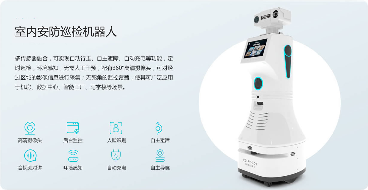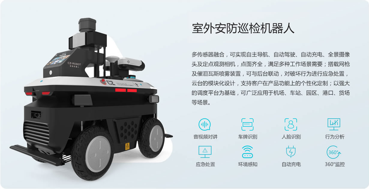 | 智能安防巡檢機(jī)器人是基于“人工智能+”設(shè)計開發(fā)的智能機(jī)器人平臺,集機(jī)器人視覺 系統(tǒng)、音視頻數(shù)據(jù)采集、消防和安防、無人駕駛技術(shù)于一體,搭載360°紅外攝像、超聲波雷達(dá)、雙目視覺攝像頭、網(wǎng)槍、催淚瓦斯噴射器、水炮、干粉滅火器等設(shè)備,基于輪式小車 實(shí)現(xiàn)全天候自動巡邏,360度聲音圖像同步回傳,自動躲避行人及障礙物。支持快速行走功 能,當(dāng)發(fā)生異常時,可實(shí)現(xiàn)快速部署及現(xiàn)場支援,為用戶提供智能安全服務(wù),是社區(qū)、學(xué)校 等公共場所人民群眾的保護(hù)神! |