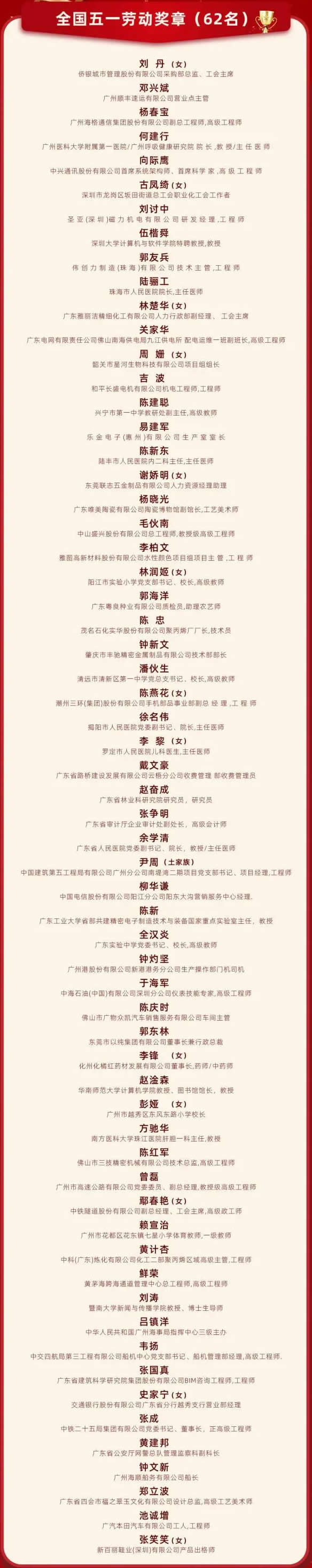 2021年廣東省全國五一勞動獎章獲得者名單