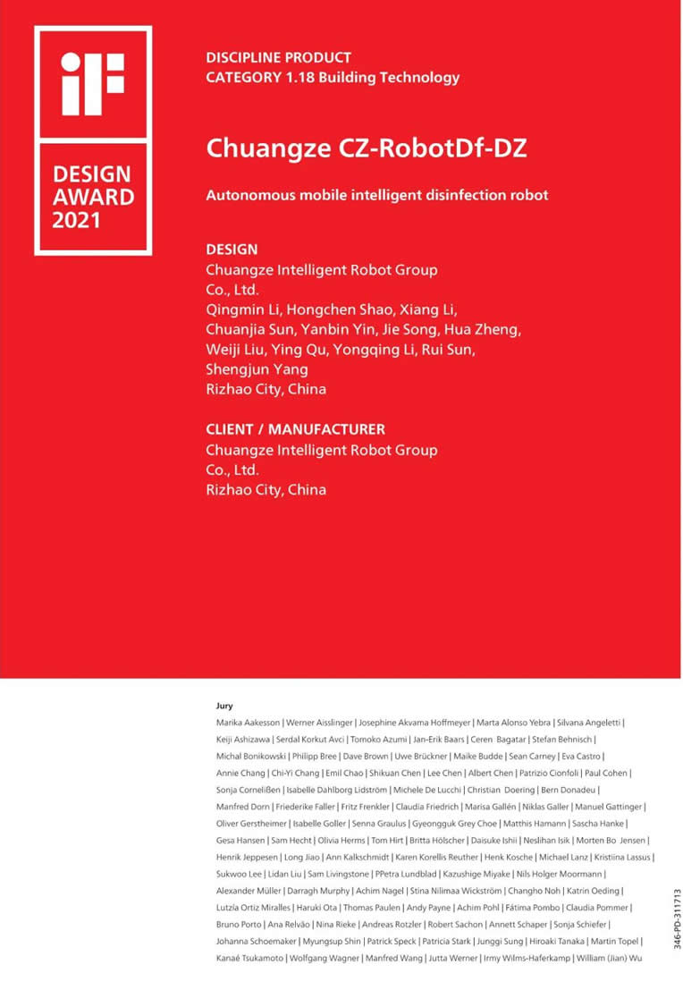 “好的設計賦予產品靈魂”。今年iF設計獎共有來自52個國家的近10000件作品參賽,評選過程競爭十分激烈,入選2021年iF設計獎的移動式消毒機器人企業共有兩家:中國的創澤集團和丹麥的Blue Ocean Robotics。創澤集團榮獲此次獎項表明其創新產品設計和品質獲得了國際認可,也是對創澤集團AI應用創新引L力的肯定。