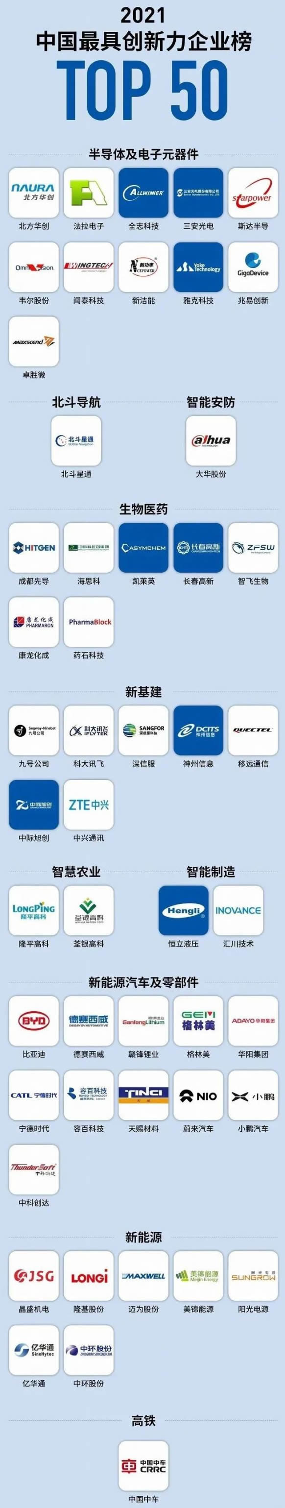 提名50家中國具創新力的企業, 覆蓋新基建、半導體及電子元器件、新能源汽車及零部件、新能源、智能制造、生物醫藥、智慧農業、G鐵等10個L域。 值得注意的是,相比去年,上榜企業更新率超80%,并聚焦更多細分L域和傳統行業,挖掘出更多潛力企業和“隱形G軍”,詮釋中國的創新精神。