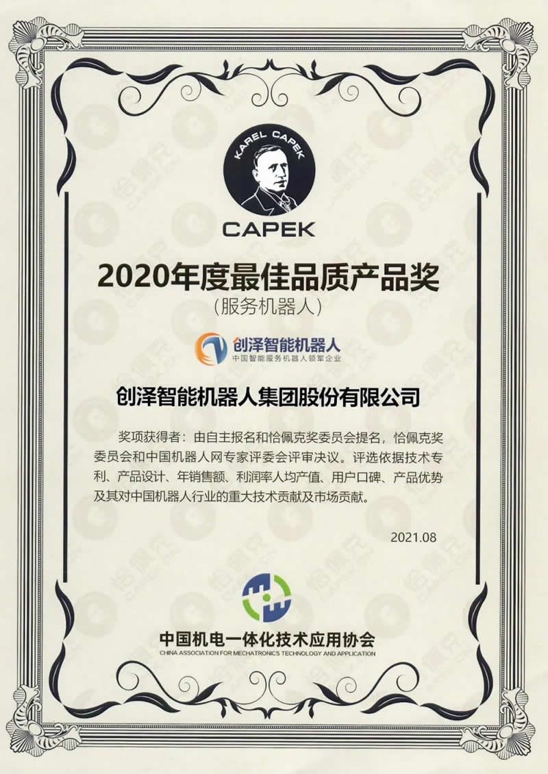 此次創(chuàng)澤集團憑借在人工智能和機器人L域的突出表現(xiàn),成功從恰佩克獎主辦方和評委會層層篩選中脫穎而出,榮獲恰佩克“2020年度佳品質(zhì)產(chǎn)品獎”。這不僅意味著創(chuàng)澤集團的產(chǎn)品與技術(shù)受到恰佩克評委會的肯定,同樣證明創(chuàng)澤集團被行業(yè)內(nèi)部的認可與肯定。