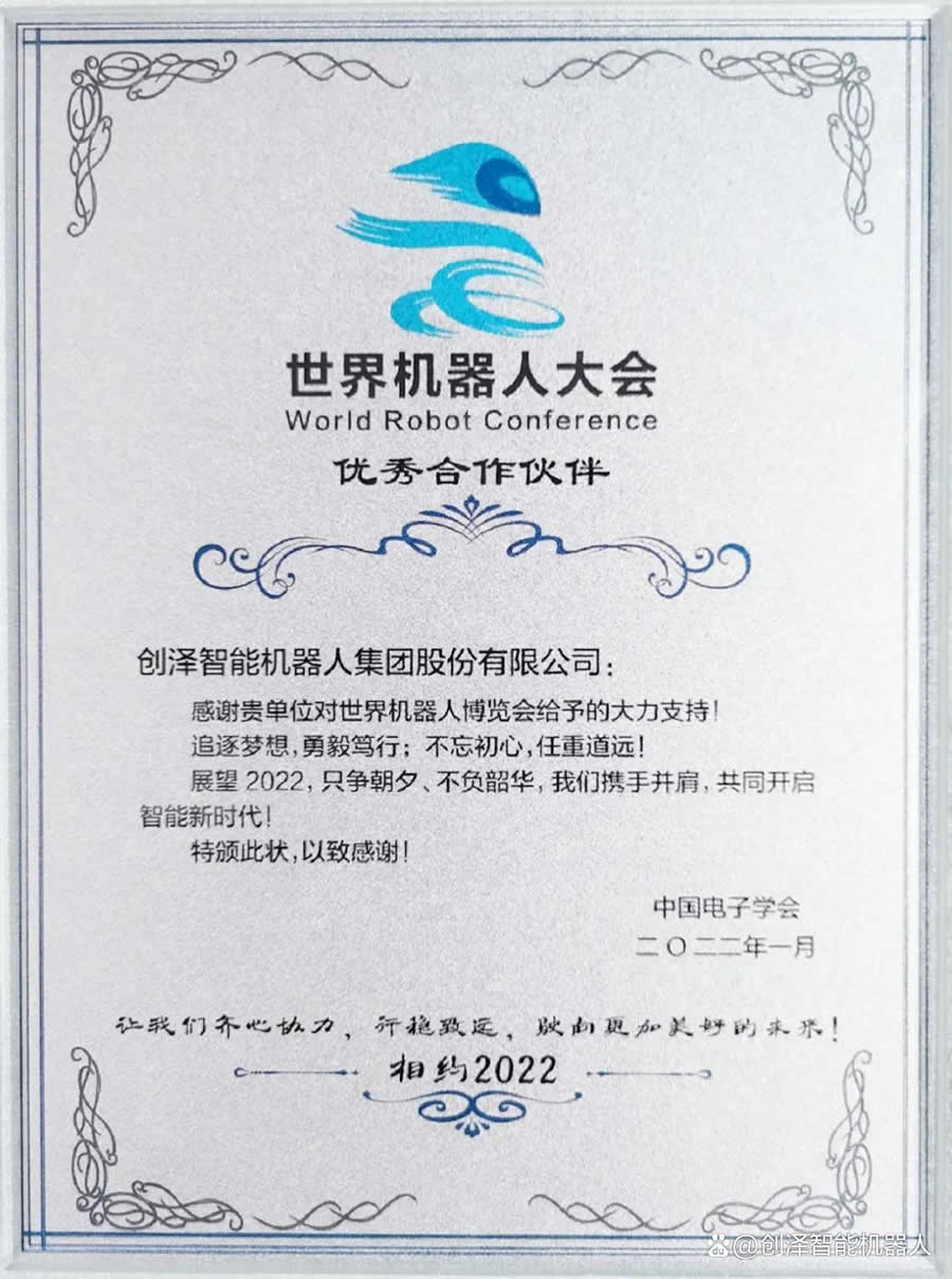 智能科技 創新不止!創澤集團榮獲2021年世界機器人大會“優秀合作伙伴”稱號 |