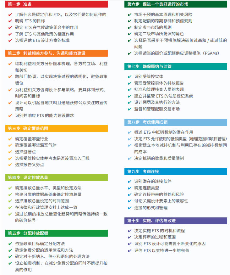 這些步驟之間相互依存,每一步所作的選擇都將對(duì)其他步驟的決策產(chǎn)生重要影響。在實(shí)踐中,ETS 的設(shè)計(jì)過(guò)程是“迭代”而 非“線性”的。2016 年初版手冊(cè)發(fā)布之后,隨著 ETS 在各個(gè) 國(guó)家和地區(qū)的發(fā)展,很多新見解、新方法和新設(shè)計(jì)思路都影響著 ETS 的運(yùn)行方式,也進(jìn)一步加深了我們對(duì)于 ETS 的理解和認(rèn)識(shí)。所有這些新內(nèi)容我們都在本手冊(cè)的相關(guān)章節(jié)中予以更新。