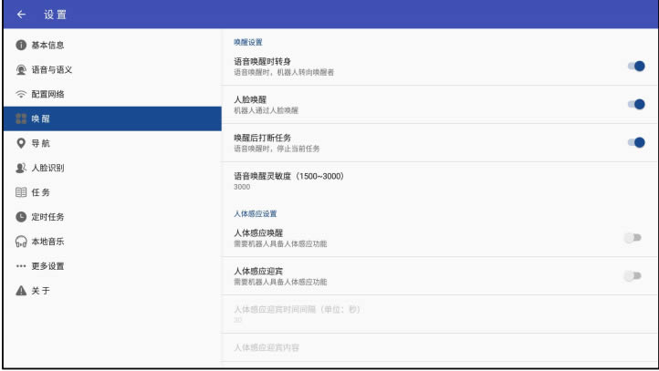 喚醒包含:人臉喚醒,語音喚醒,人體感應(yīng)喚醒。用戶可根據(jù)自己要求修改喚醒迎賓詞, 喚醒間隔時間