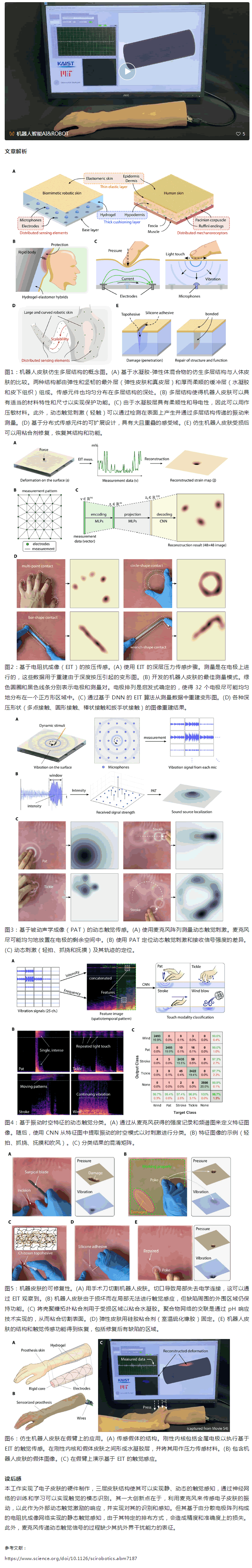 韓國(guó)科學(xué)技術(shù)院的J. Kim課題組提出了一種基于水凝膠彈性體混合物的仿生機(jī)器皮膚,可以同時(shí)實(shí)現(xiàn)靜態(tài)(按壓)、動(dòng)態(tài)(表面振動(dòng)、滑動(dòng)等)觸覺(jué)的識(shí)別。皮膚分為三層結(jié)構(gòu),表面的一層起保護(hù)作用,中間的水凝膠層構(gòu)成機(jī)器皮膚的主體,由于其具有導(dǎo)電性,因此可以實(shí)現(xiàn)電信號(hào)的傳遞。水凝膠層和底層之間分布著電J和麥克風(fēng)陣列,由于水凝膠層的可形變性,其對(duì)壓力可以產(chǎn)生阻抗變化的響應(yīng),電J陣列通過(guò)電阻抗成像技術(shù)可以實(shí)現(xiàn)按壓壓力的識(shí)別;當(dāng)皮膚表面有振動(dòng)、摩擦的激勵(lì)時(shí),振動(dòng)通過(guò)水凝膠傳遞至麥克風(fēng),便可以產(chǎn)生相應(yīng)的電信號(hào)響應(yīng)。通過(guò)神經(jīng)網(wǎng)絡(luò)的訓(xùn)練和學(xué)習(xí),可以實(shí)現(xiàn)靜態(tài)和動(dòng)態(tài)觸覺(jué)的模態(tài)識(shí)別。