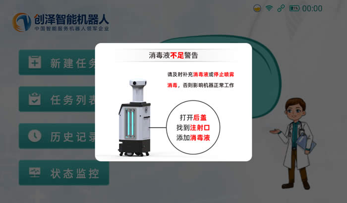 消毒機(jī)器人的屏幕還可以顯示消毒機(jī)器人運(yùn)行過(guò)程中的狀態(tài)提醒,如上圖所示,當(dāng)消毒機(jī)器人的消毒液不多的時(shí)候,會(huì)在屏幕顯示添加消毒液的提醒信息。