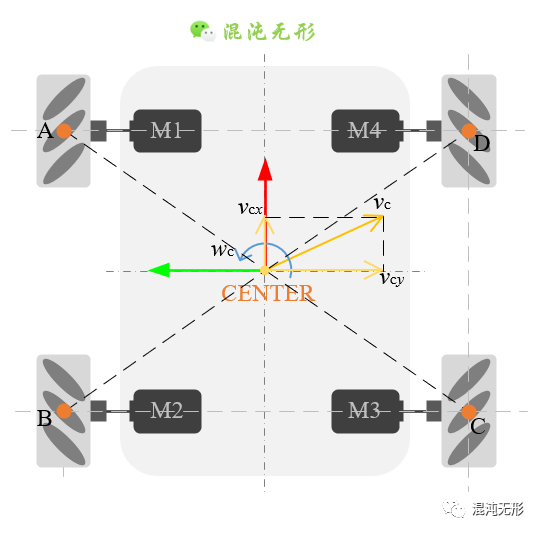 麥輪平臺(tái)是全向移動(dòng)機(jī)器人的原因是其有三個(gè)自由度,意味著可以在平面內(nèi)做出任意方向平移同時(shí)自旋的動(dòng)作,如圖 2.1所示,采用任意方向的線速度及角速度[vc w]T來描述CENTER的速度,而vc可沿著坐標(biāo)軸分解為兩個(gè)分速度,表示為[vcx vcy w]T。
