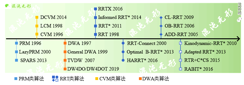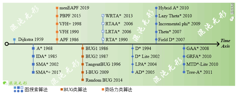 圖規劃算法根據路徑生成方式的不同分為三類,其中以圖搜索算法為主,以及BUG算法和勢場力算法。