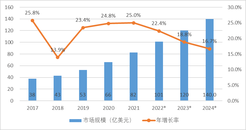 2017 年以來(lái), 特種機(jī)器人產(chǎn)業(yè)規(guī)模年均增長(zhǎng)率達(dá)到 21.7%, 預(yù)計(jì) 2022 年特種機(jī)器人市場(chǎng)規(guī)模超過(guò) 100 億美元, 2024 年特 種機(jī)器人市場(chǎng)規(guī)模將有望達(dá)到 140 億美元。