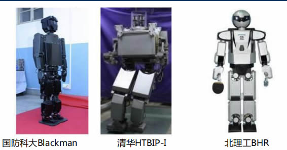 • 國防科大起步較早,2000年研制“先行者”,2003年研發Blackman,身G1.55m,重63.5kg,共36個自由度,快步行速度 可以達到1km/h,在機器人轉彎、不平整地面上行走等方面研究深入。