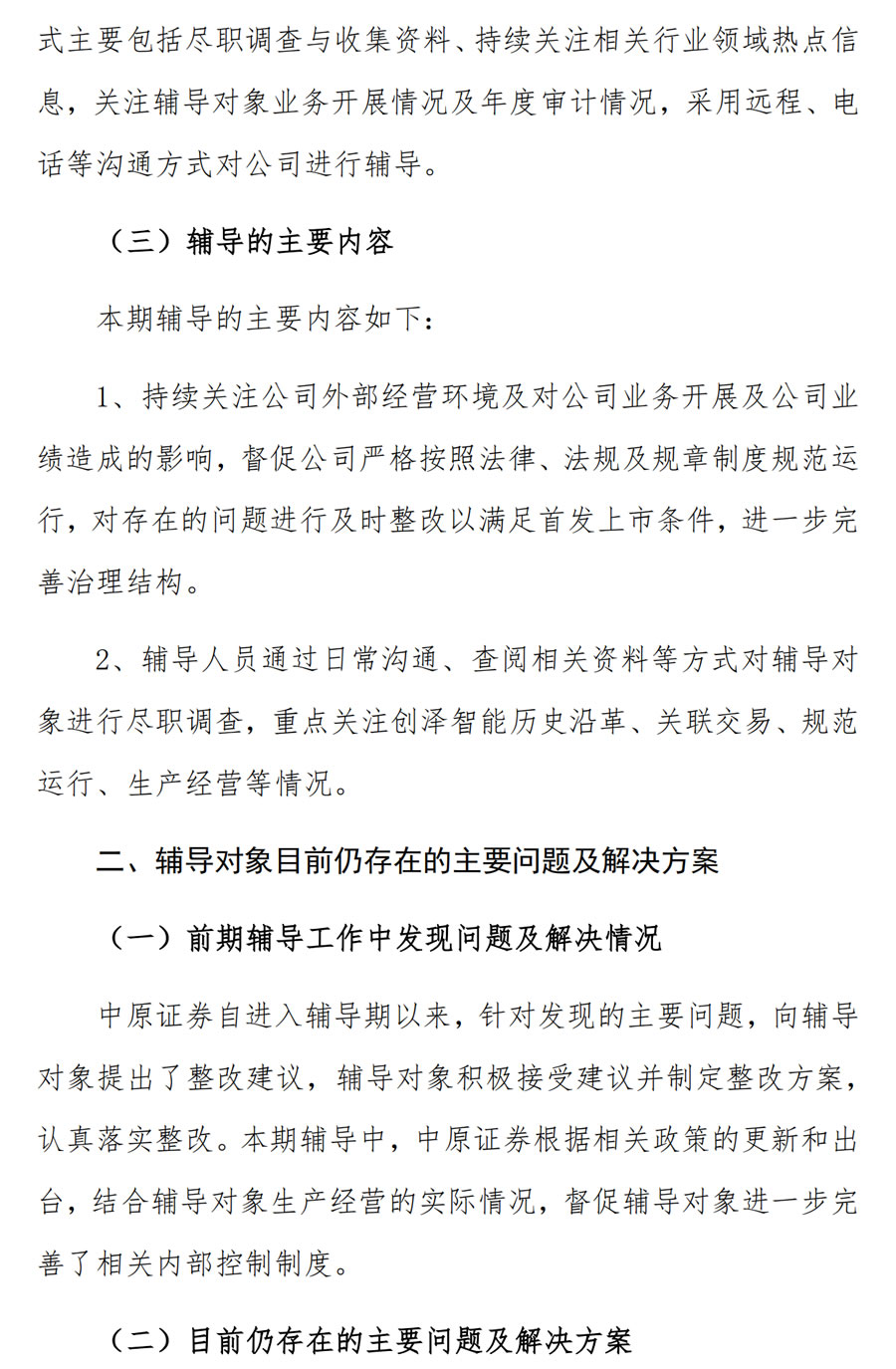 2、輔導人員通過日常溝通、查閱相關資料等方式對輔導對象進行盡職調查,重點關注創(chuàng)澤智能歷史沿革、關聯(lián)交易、規(guī)范運行、生產經營等情況。