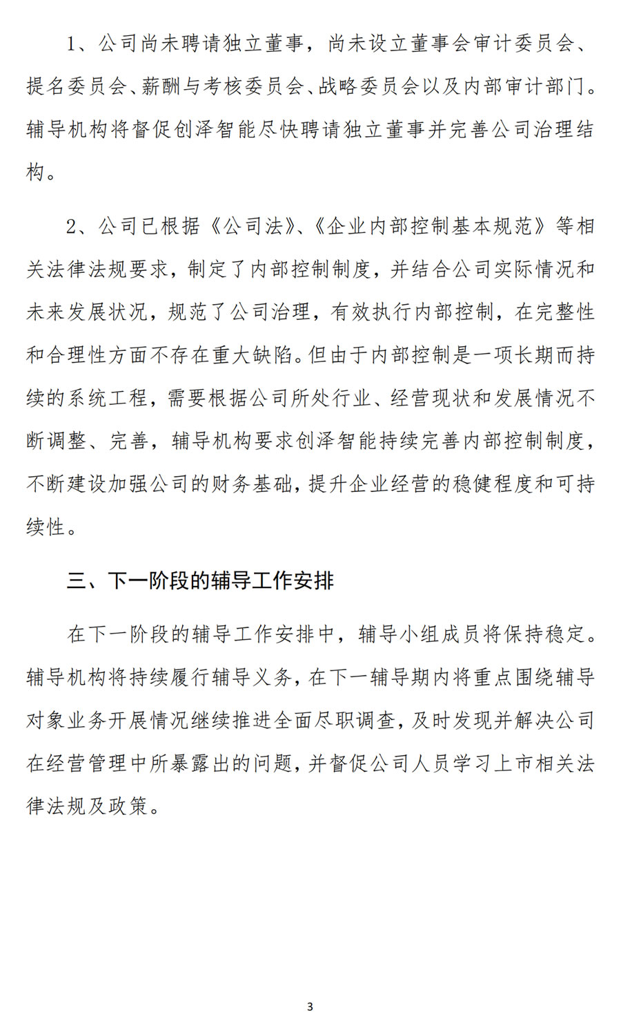 2、公司已根據《公司法》、《企業(yè)內部控制基本規(guī)范》等相關法律法規(guī)要求,制定了內部控制制度,并結合公司實際情況和未來發(fā)展狀況,規(guī)范了公司治理,有效執(zhí)行內部控制,在完整性和合理性方面不存在重大缺陷。但由于內部控制是一項長期而持續(xù)的系統(tǒng)工程,需要根據公司所處行業(yè)、經營現(xiàn)狀和發(fā)展情況不斷調整、完善,輔導機構要求創(chuàng)澤智能持續(xù)完善內部控制制度,不斷建設加強公司的財務基礎,提升企業(yè)經營的穩(wěn)健程度和可持續(xù)性。