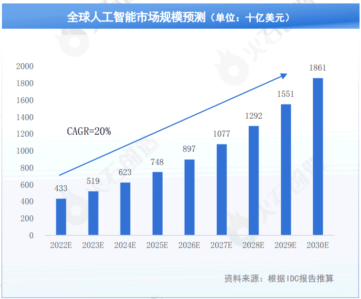 據IDC估算,2022年Al市場規模達到4328億美元,按同比增長近20%推算,2030年人工智能市場規模將超過1.8萬億美元。