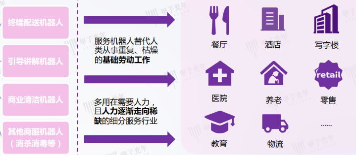 常見的商用場景中,商用服務機器人主要分為終端配送類機器人,商用清潔類機器人,引導講解類機器人等,被廣泛應用在餐廳、酒店、娛樂、