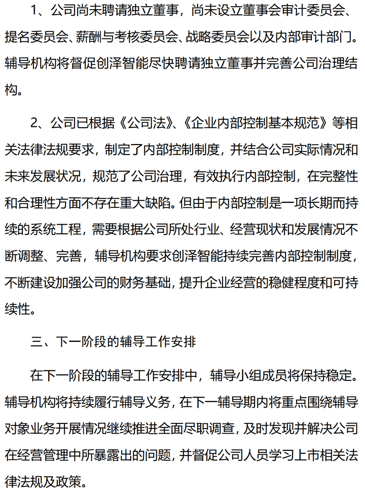 中原證券關于創澤機器人上市輔導內容,對公司業務開展及公司業績造成的影響,督促公司嚴格按照法律,法規及規章制度規范運行,關注創澤智能歷史沿革生產經營等情況