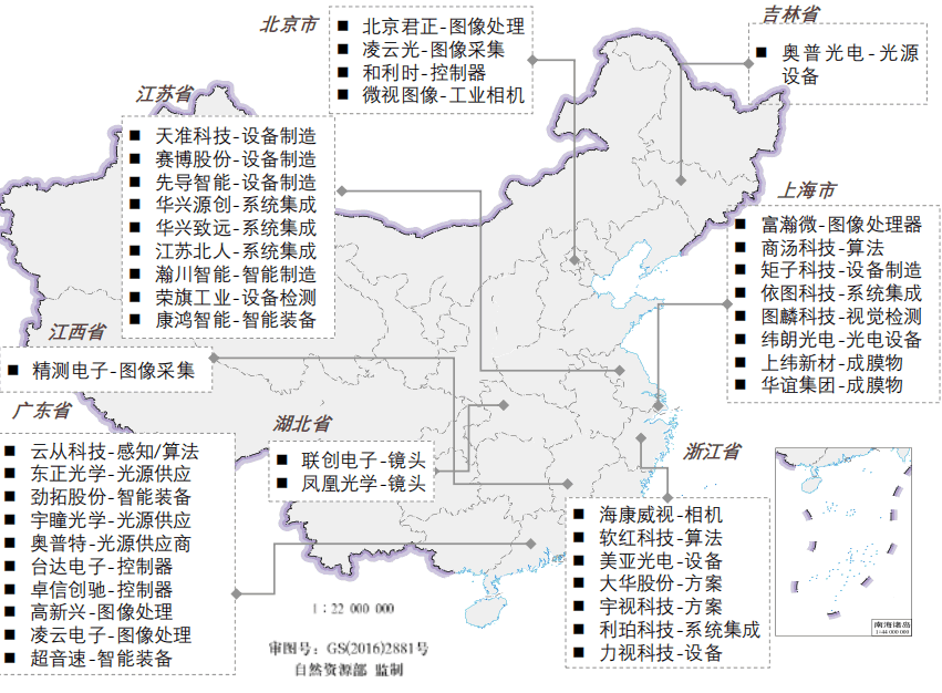 其中,廣東省在機(jī)器視覺檢測設(shè)備、算法與集成布局較為完善,江蘇省與浙江省的設(shè)備制造及系統(tǒng)集