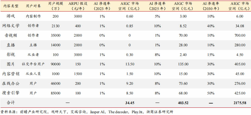 式,測(cè)算國(guó)內(nèi) 2023 年、2025 年和 2030 年 AIGC 市場(chǎng)空間。