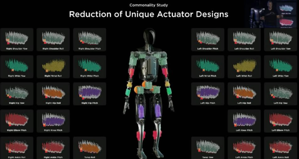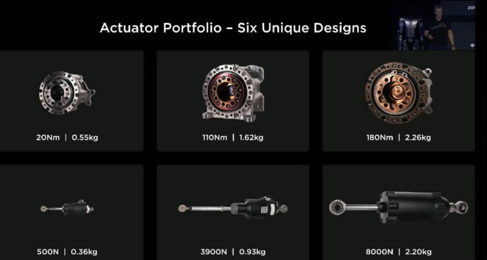 電機驅動上,Optimus擁有2.3KWH、52V電壓的電池組,內置電子電器元件的一體單位,支持人形機器人工作一整天;選用 28個定制關節驅動器,復用汽車動力總成設計經驗,設計6種關節驅動器,包括3種不同規格的舵機(采用諧波減速器)和3種 不同規格的直線執行器(采用永磁電機,可抬動1.5噸三角鋼琴的),找到成本與效率的佳組合。