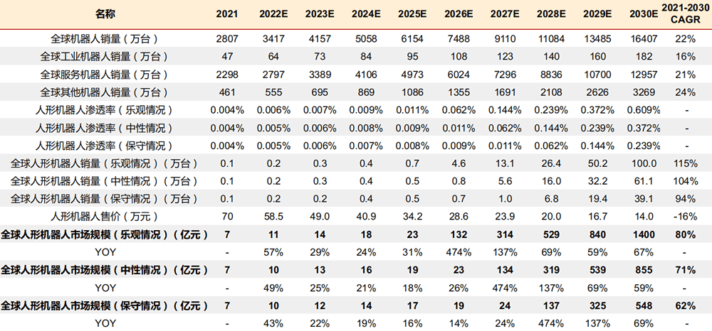 預測2030年人形機器人市場規模保守/中性/樂觀預估下,分別有望達548/855/1400億元