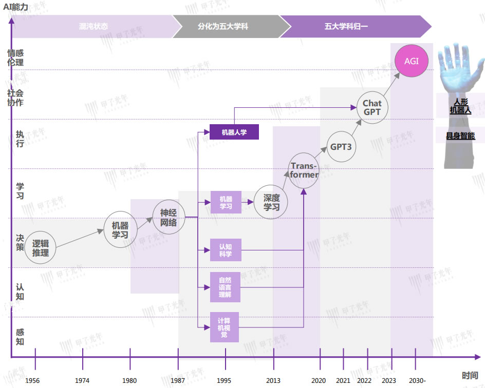 憑借機器視覺,自然語言理解等人工智能技術的發展,初代“AI+”機器人產品逐步成熟,生成式AI的爆發與通用人工智能的曙光