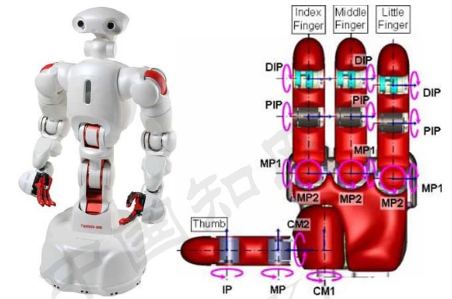 因此,我們定義靈巧手是指數≥3,自由度≥9 的末端執行器。例如日本的 TWENDY-ONE 機器人,其靈巧手擁有 4 根手指和 13 個自由度。